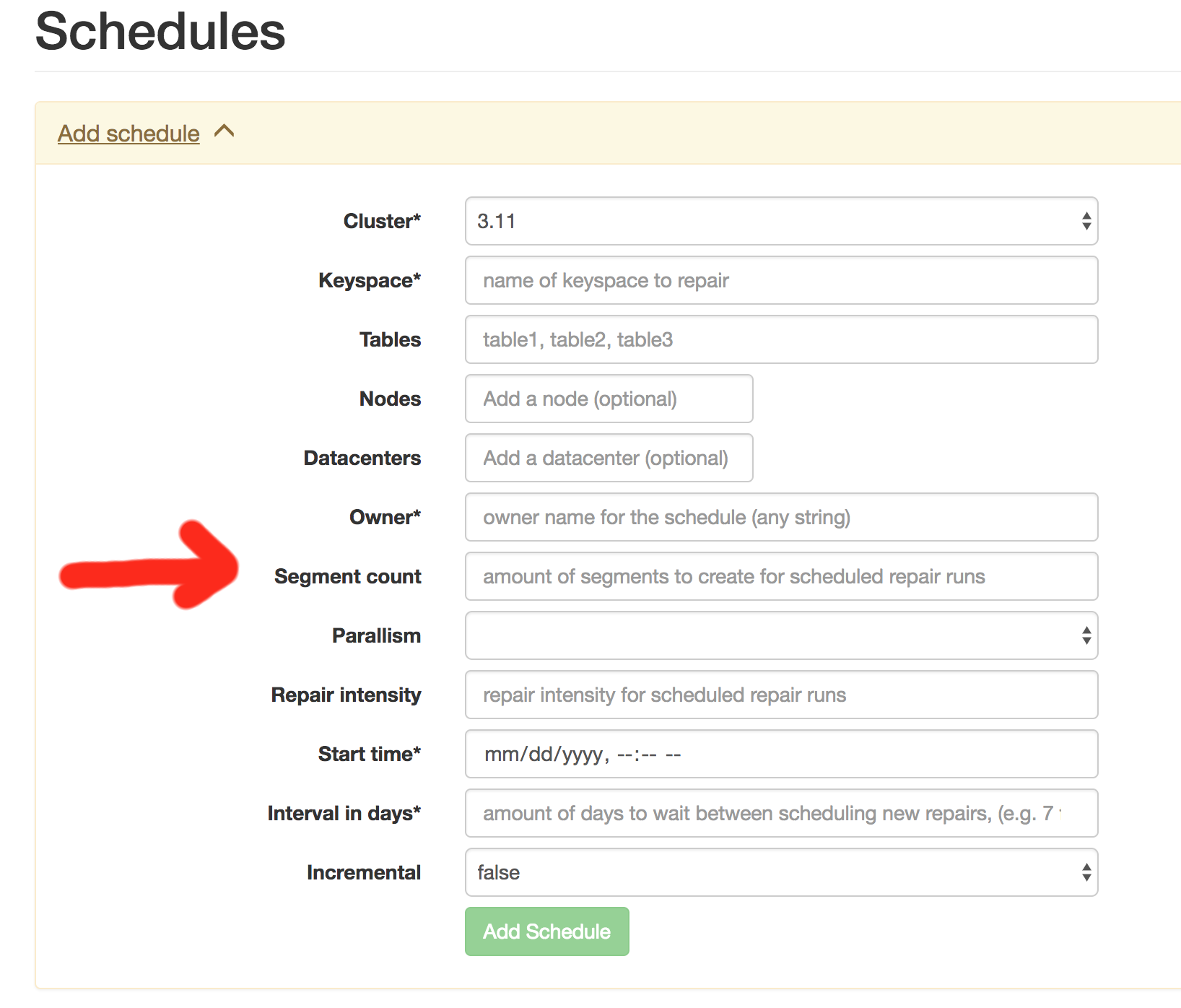 With high node density and fewer nodes, each token range becomes larger. When setting up a repair schedule with Reaper, you’ll see a segment count field. I can’t understate how important it is to evaluate this setting in conjunction with picking an appropriate compaction strategy.